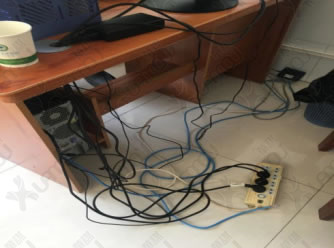办公桌电线杂乱,直接拖在地上,整体影响美观,容易积灰,不方便打扫,且存在绊倒的风险。
