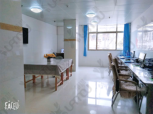 我们把办公桌统一靠墙,把破旧的长方桌重新打造,罩上了桌罩, 即增加了空间的利用率,一方面方便了病人就诊,另一方面同事们有了独立的学习桌,可以围在一起,讨论分析疑难问题。桌上手工盆景增加了学习的风采。