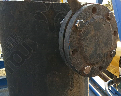 在负压罐侧面加一个人孔,用法兰封闭,进入负压罐的树叶会堆积在人孔处,刮泥机堵塞时只需将法兰取掉,从人孔处将树叶掏出即可